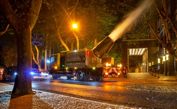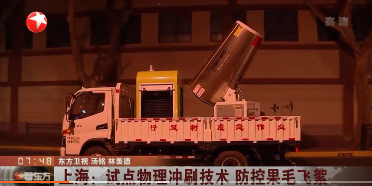 進(jìn)入四月,上海30多萬棵懸鈴木行道樹又進(jìn)入了飛絮季。為了防控果毛,今年綠化部門首次試點(diǎn)了物理沖刷技術(shù),嘗試用高射程噴霧機(jī)的風(fēng)力和水霧,把已成熟欲脫落的果毛提前吹落。 昨晚十點(diǎn),首次果毛飛絮物理沖刷試點(diǎn)在徐匯區(qū)展開。作業(yè)車隊(duì)沿著陜西南路緩慢前行,排在第一輛的程力高射風(fēng)力機(jī)車首先將巨大的風(fēng)筒對(duì)準(zhǔn)樹枝,把成熟欲脫落的果毛吹落。第二輛程力噴霧降塵車緊接著噴灑水霧將果毛降至地面,緊隨其后的第三輛高壓灑水車再將果毛集中沖到路牙邊,最后由機(jī)動(dòng)清掃車將果毛收集清掃。