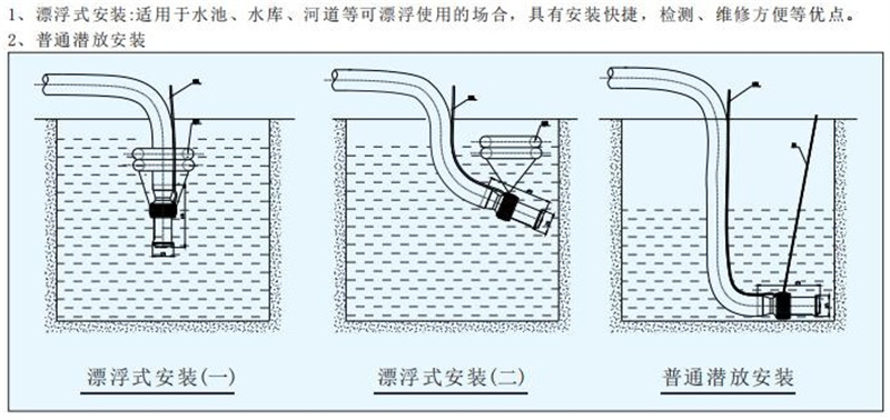 7. 用浮球吊放的電泵工作時,要特別注意水位下降情況,尤其是在井下工作時, 千萬不能脫水運行,否則會燒壞電機和其它部件。也不能放到水底污泥中工作,造成散熱不好而損壞泵電機。