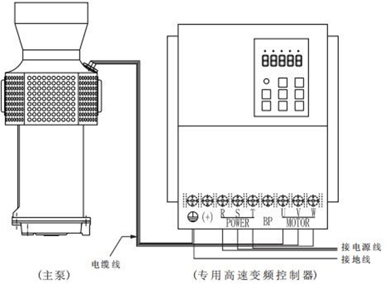 3. 泵應單獨配置相應的電閘或開關, 變頻驅動器及泵外殼上接地端子要接上地線,電泵引出線中有黃綠相間的雙色線為接地線,必須可靠接地。